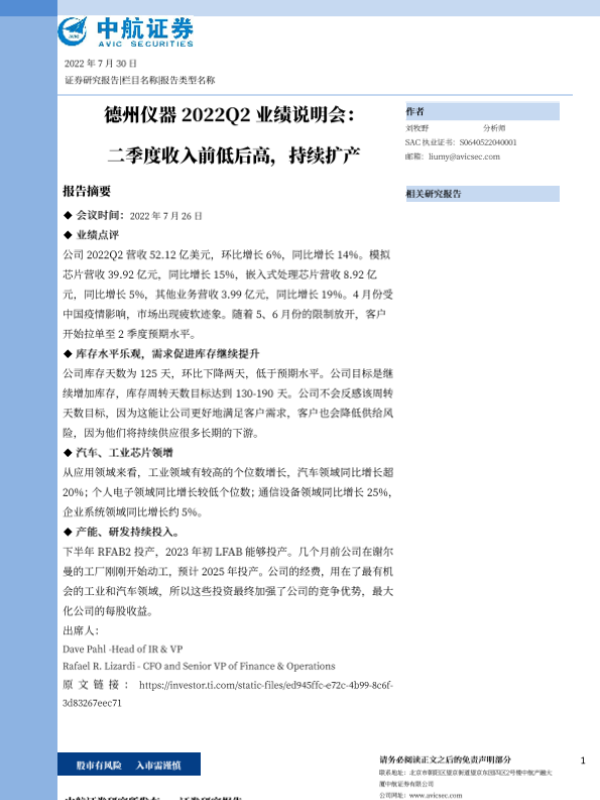 【中航证券】【20220730】德州仪器2022Q2业绩说明会:二季度收入前低后高,持续扩产-10页 行业研究