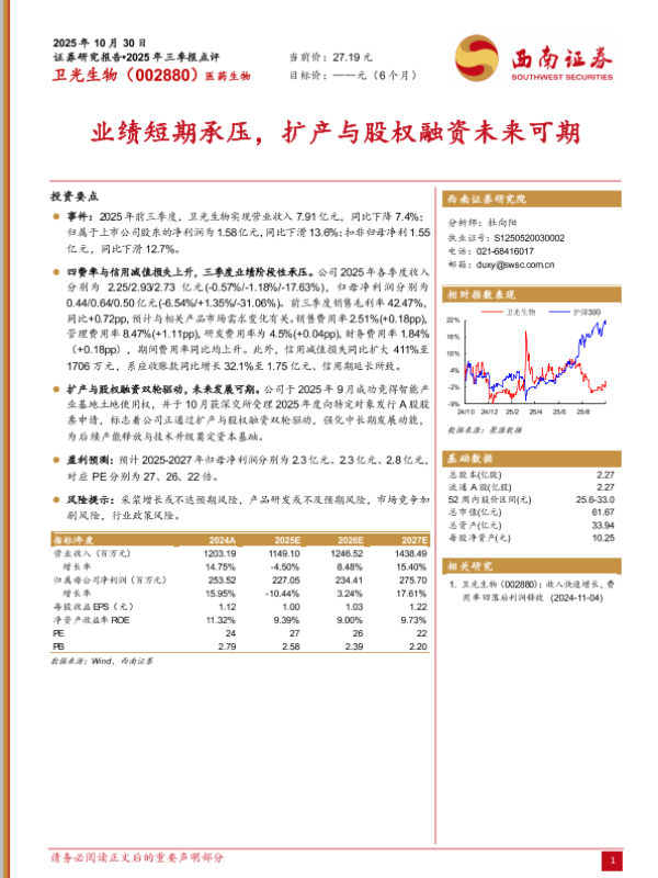 【西南证券】【202510】卫光生物(002880):业绩短期承压,扩产与股权融资未来可期-6页 证券期货研究报告
