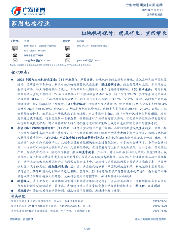 【广发证券】【20230210】家用电器行业专题研究:扫地机再探讨:拐点将至,重回增长-22页 行业研究