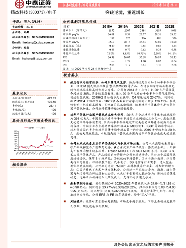 【中泰证券】【20200428】扬杰科技-300373.SZ-突破逆境,重返增长-22页 行业研究
