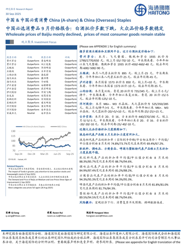【海通国际】【202509】中国必选消费品行业9月价格报告:白酒批价多数下跌,大众品价格多数稳定-14页 证券期货研究报告