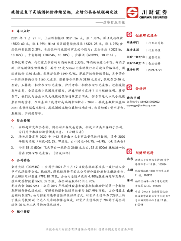【川财证券】【20210121】消费行业日报:疫情反复下高端酒批价持续坚挺,业绩仍具备较强确定性-3页 行业研究