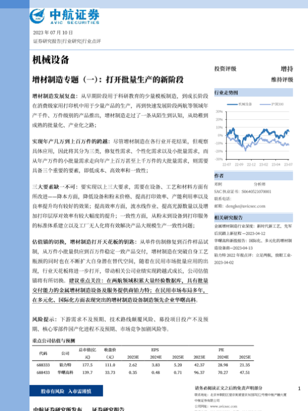 【中航证券】【20230710】机械设备行业增材制造专题(一):打开批量生产的新阶段-15页 行业研究