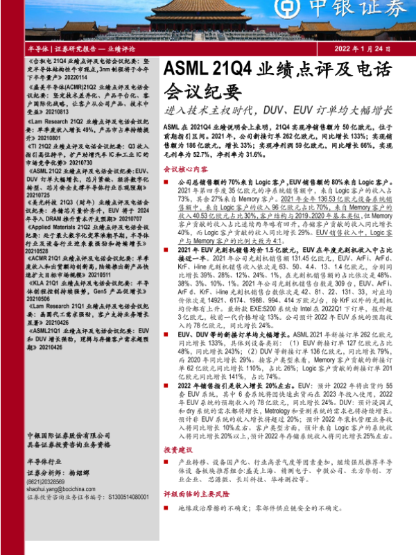 【中银证券】【20220124】ASML21Q4业绩点评及电话会议纪要-进入技术主权时代,DUV、EUV订单均大幅增长-12页 行业研究