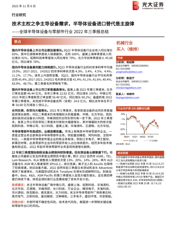 【光大证券】【20221106】机械行业全球半导体设备与零部件行业2022年三季报总结:技术主权之争主导设备需求,半导体设备进口替代是主旋律-24页 行业研究
