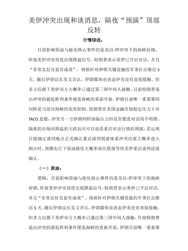 【天富期货有限公司】【202603】美伊冲突出现和谈消息,隔夜“预演”顶部反转-13页 证券期货研究报告