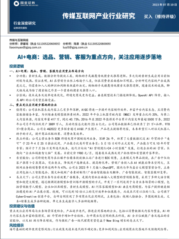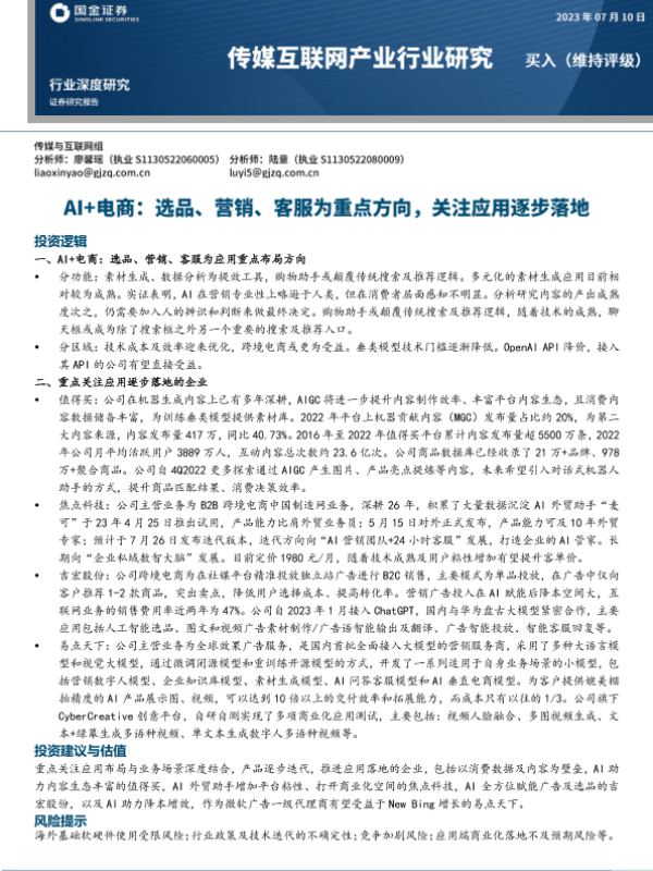 【国金证券】【20230710】传媒互联网产业行业研究:AI+电商,选品、营销、客服为重点方向,关注应用逐步落地-16页 行业研究