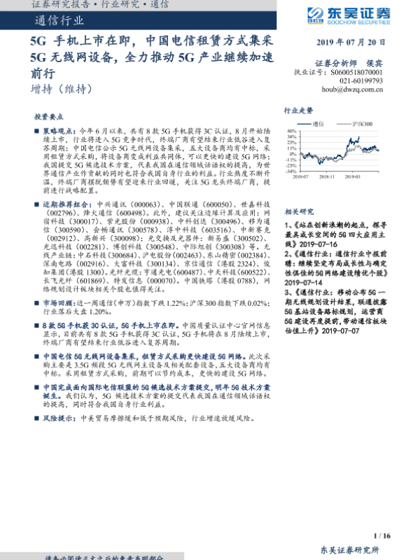 【东吴证券】【20190720】通信行业:5G手机上市在即,中国电信租赁方式集采5G无线网设备,全力推动5G产业继续加速前行-16页 行业研究