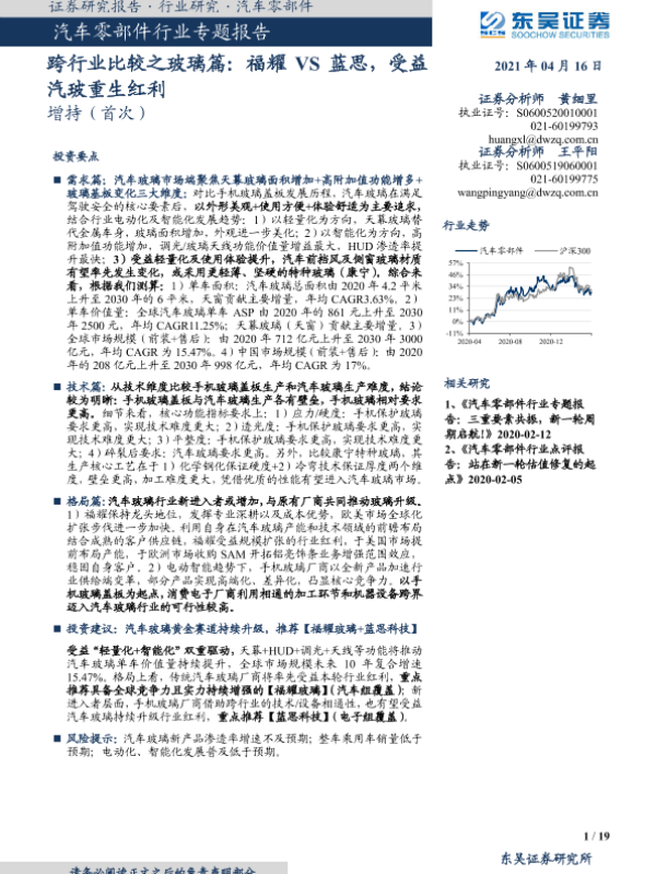 【东吴证券】【20210416】汽车零部件行业专题报告:跨行业比较之玻璃篇:福耀VS蓝思,受益汽玻重生红利-19页 行业研究
