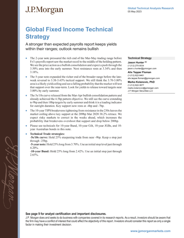 【J.P. Morgan】【20230505】JPMorgan-Global Fixed Income Technical Strategy A stronger than expected payrolls report keeps yields within their ranges; outlook remains bullish-12页 行业研究