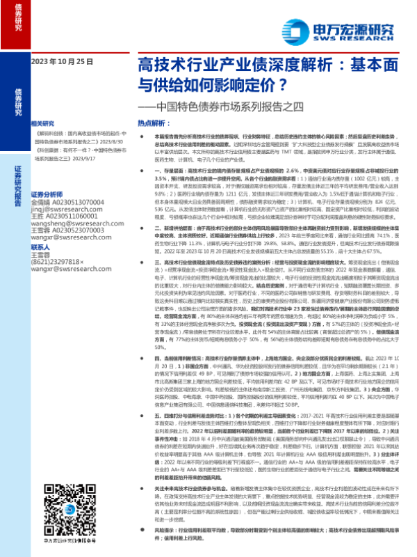 【申万宏源】【20231025】中国特色债券市场系列报告之四:高技术行业产业债深度解析,基本面与供给如何影响定价?-19页 行业研究