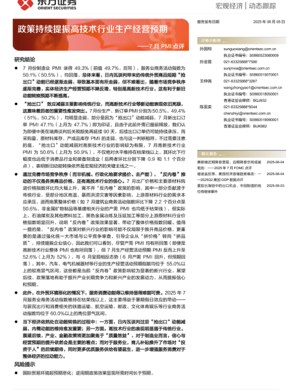 【东方证券】【20250805】7月PMI点评:政策持续提振高技术行业生产经营预期-3页 证券期货研究报告