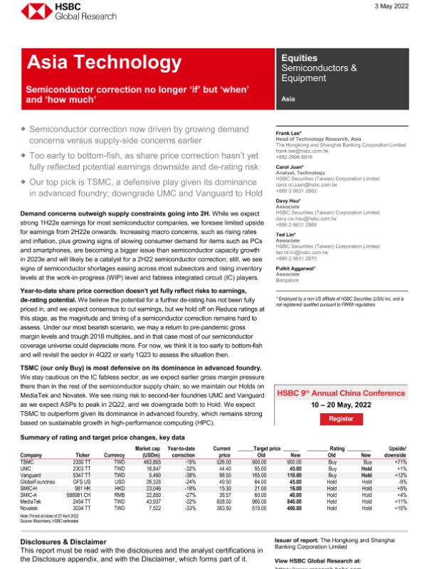 【The Hongkong and Shanghai Banking Corporation Limited】【20220503】亚太地区半导体及设备行业-半导体调整不再是“如果”,而是“何时”和“多少”-61页 行业研究