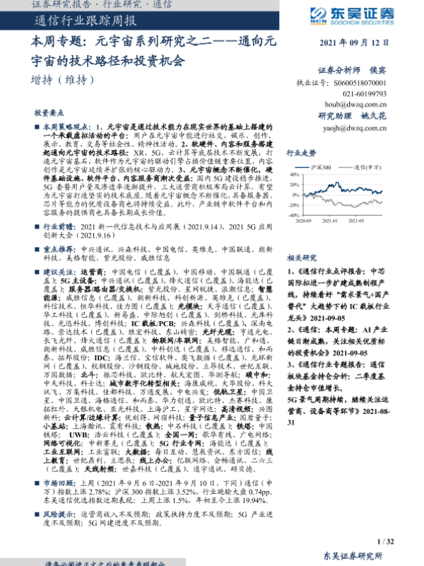 【东吴证券】【20210912】通信本周专题:元宇宙系列研究之二——通向元宇宙的技术路径和投资机会-32页 行业研究