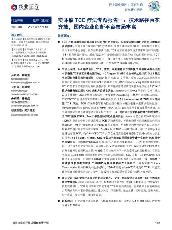 【兴证医药】【202512】实体瘤TCE疗法专题报告一:技术路径百花齐放,国内企业创新平台布局丰富-54页 证券期货研究报告