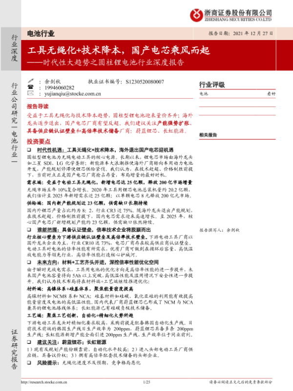 【浙商证券】【20211227】时代性大趋势之圆柱锂电池行业深度报告-25页 行业研究