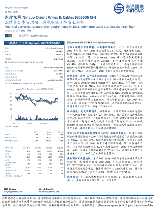 【海通国际】【20240328】东方电缆-603606.SH-业绩符合市场预期,海缆版块保持高毛利率-12页 行业研究