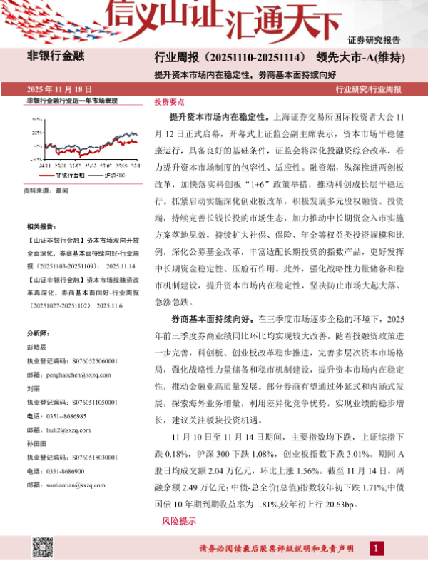 【山西证券】【202511】非银行金融行业周报(20251110-20251114)领先大市-A(维持))提升资本市场内在稳定性,券商基本面持续向好-9页 证券期货研究报告