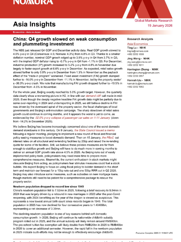 【Nomura】【202601】China Q4growthslowed onweak consumption Research Analysts andplummeting investment Asia Economics-11页 证券期货研究报告
