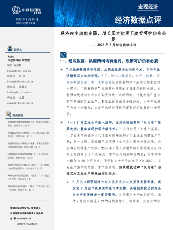【中诚信国际】【202507】经济内生动能走弱,增长压力初现下政策呵护仍有必要——2025年 7月经济数据点评-12页 宏观策略