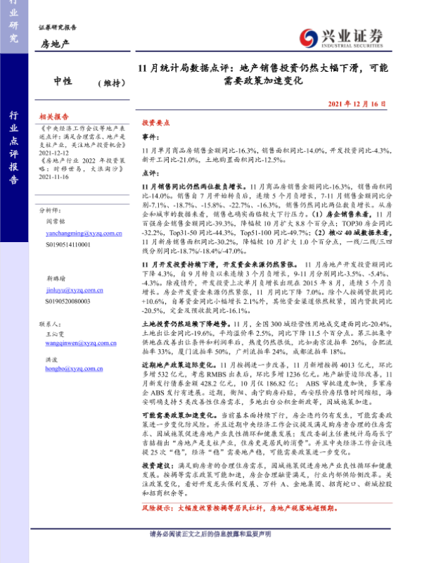 【兴业证券】【20211216】地产销售投资仍然大幅下滑,可能需要政策加速变化-2页 行业研究