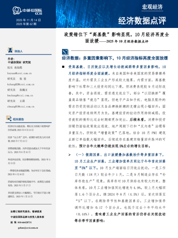 【中诚信国际】【202510】2025年10月经济数据点评:政策错位下“高基数”影响显现,10月经济再度全面放缓-12页 宏观策略
