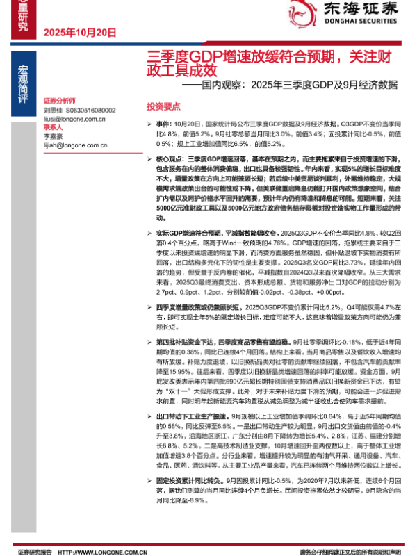 【东海证券】【202510】三季度GDP增速放缓符合预期,关注财政工具成效——国内观察:2025年三季度GDP及9月经济数据-6页 证券期货研究报告