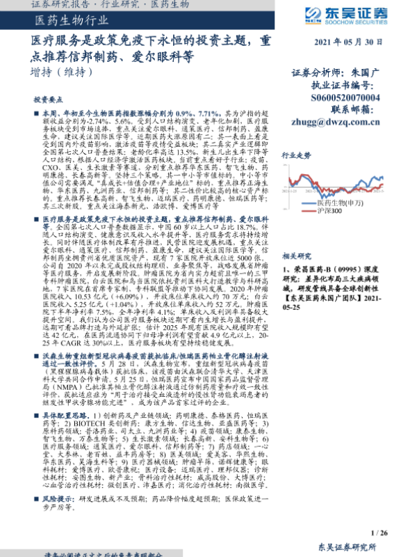 【东吴证券】【20210530】医药生物行业跟踪周报:医疗服务是政策免疫下永恒的投资主题-26页 行业研究