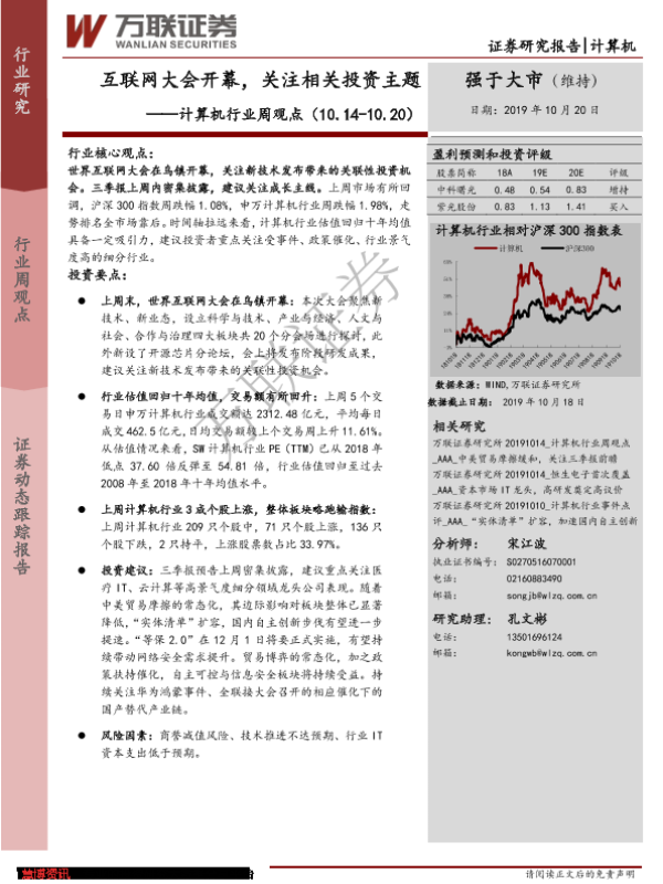 【万联证券】【20191020】20191020-万联证券-计算机行业周观点:互联网大会开幕,关注相关投资主题-12页 行业研究