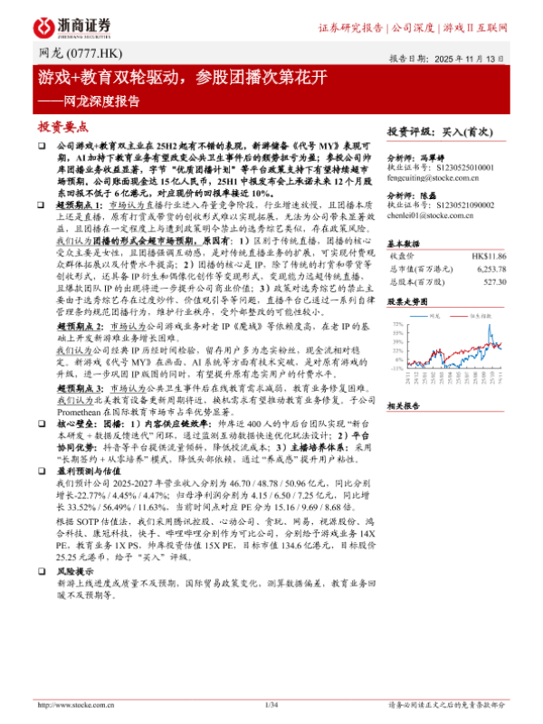 【浙商证券】【202511】网龙(0777.HK)深度报告:游戏+教育双轮驱动,参股团播次第花开-34页 证券期货研究报告