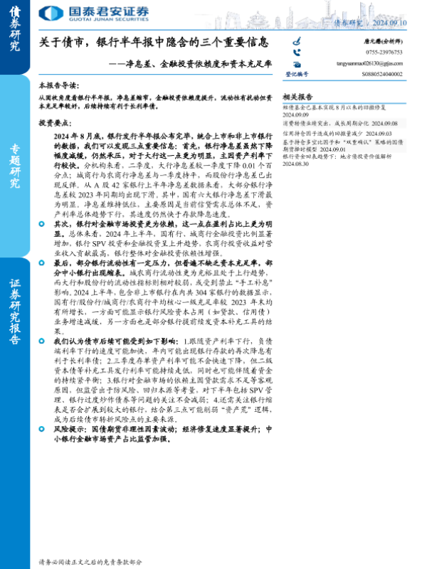 【国泰君安证券】【20240910】净息差、金融投资依赖度和资本充足率:关于债市,银行半年报中隐含的三个重要信息-14页 行业研究