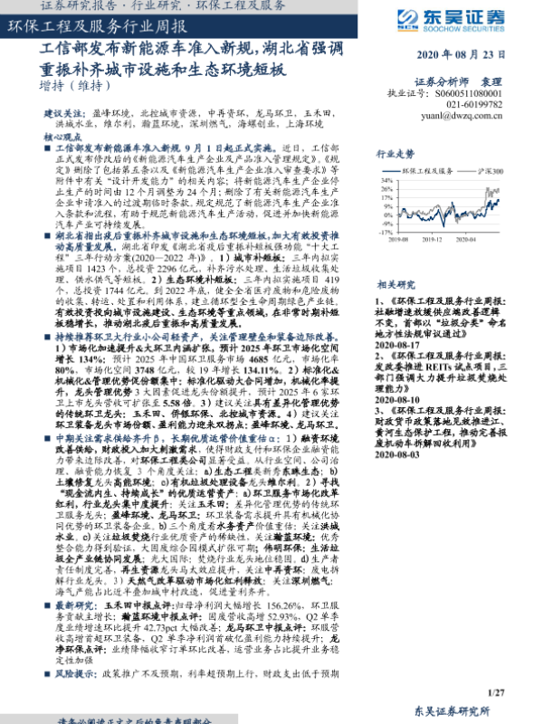【东吴证券】【20200823】环保工程及服务行业周报:工信部发布新能源车准入新规,湖北省强调重振补齐城市设施和生态环境短板-27页 行业研究