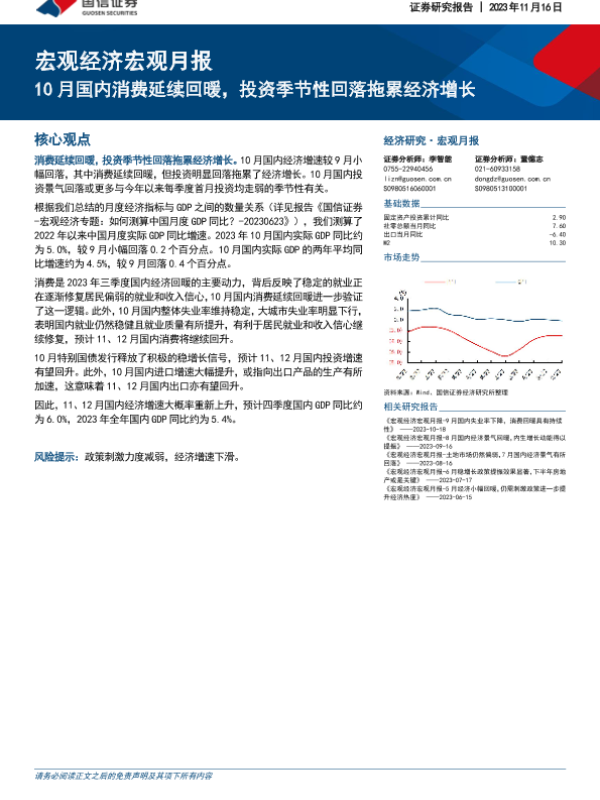 【国信证券】【20231116】宏观经济宏观月报:10月国内消费延续回暖,投资季节性回落拖累经济增长-20页 行业研究