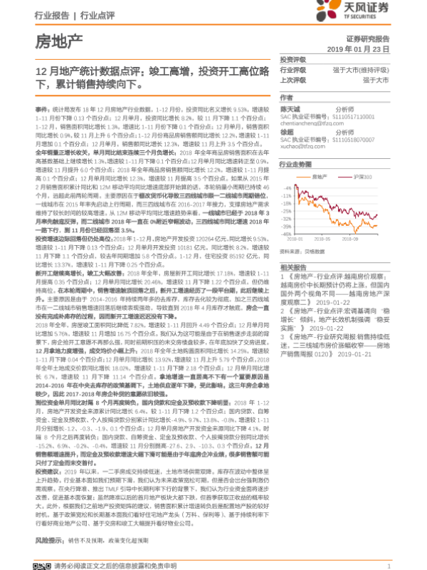 【天风证券】【20190123】12月地产统计数据点评:竣工高增,投资开工高位略下,累计销售持续向下-7页 行业研究