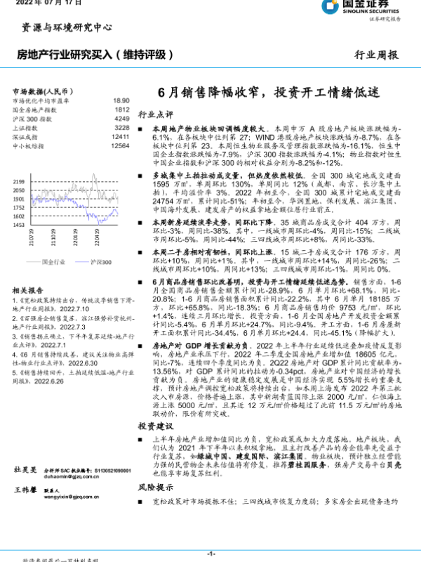 【国金证券】【20220717】6月销售降幅收窄,投资开工情绪低迷-18页 行业研究