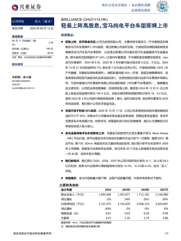 【兴业证券】【20250812】BRILLIANCE CHI-轻装上阵高股息_宝马纯电平台车型即将上市-7页 公司研究