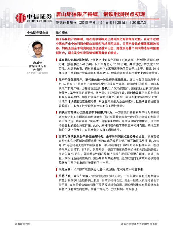 【中信证券】【20190702】20190702-中信证券-钢铁行业周报:唐山环保限产持续,钢铁利润拐点初现-13页 行业研究