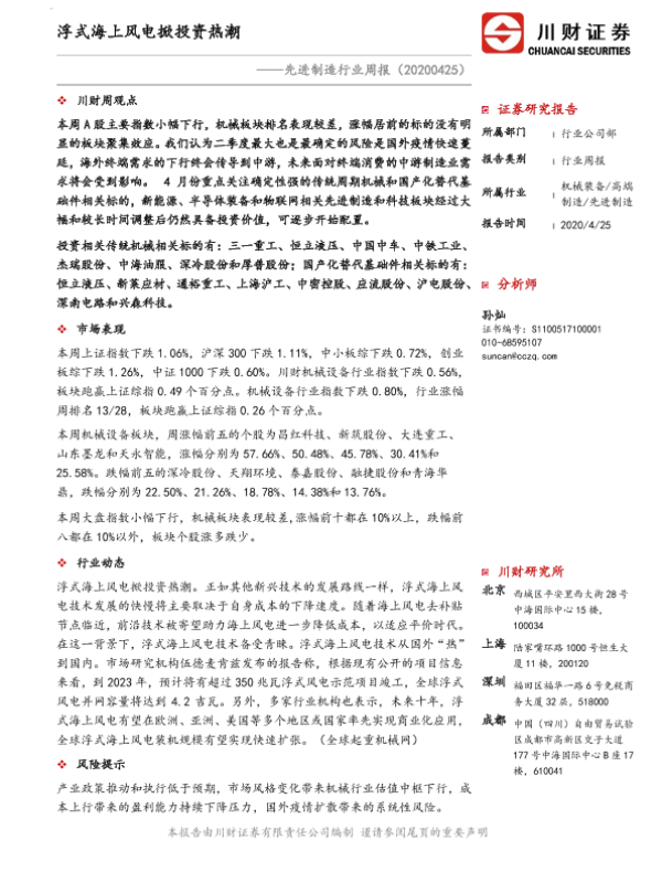 【川财证券】【20200425】先进制造行业周报:浮式海上风电掀投资热潮-10页 行业研究