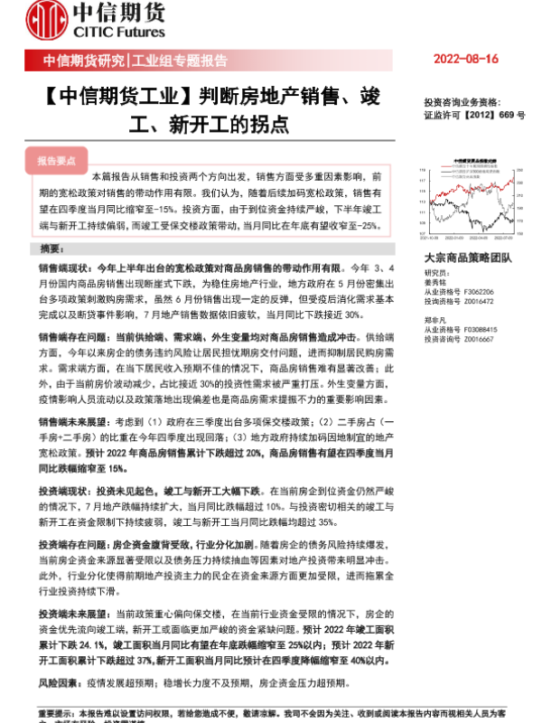 【中信期货】【20220816】工业组专题报告:判断房地产销售、竣工和新开工的拐点-24页 行业研究