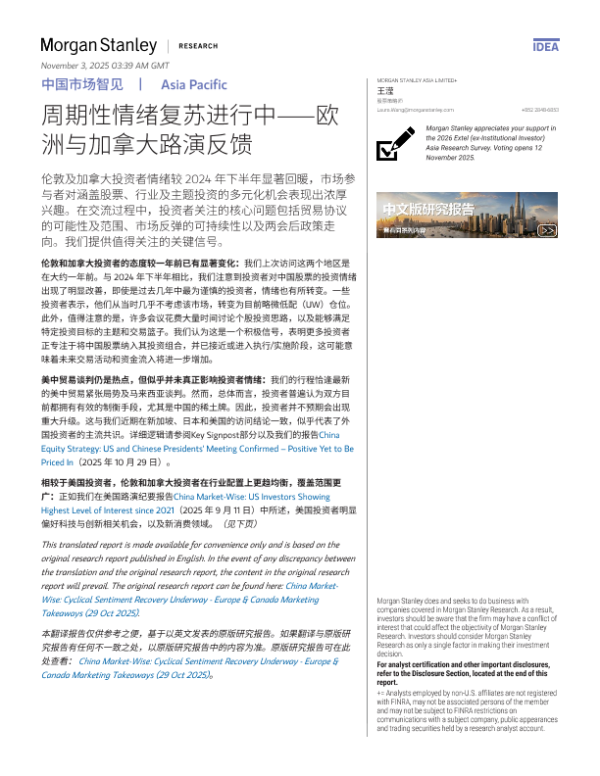 【Morgan Stanley】【202510】中国市场智见 周期性情绪复苏进行中——欧洲与加拿大路演反馈-6页 证券期货研究报告