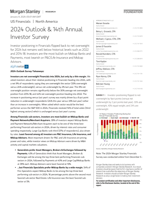 【Morgan Stanley】【20231219】Morgan Stanley-US Financials 2024 Outlook & 14th Annual Investor Survey-69页 行业研究