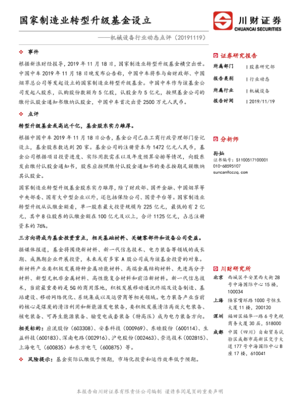 【川财证券】【20191119】机械设备行业动态点评:国家制造业转型升级基金设立-2页 证券期货研究报告