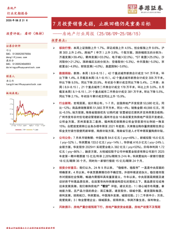 【华源证券】【20250821】房地产行业周报-7月投资销售走弱,止跌回稳仍是重要目标-17页 证券期货研究报告