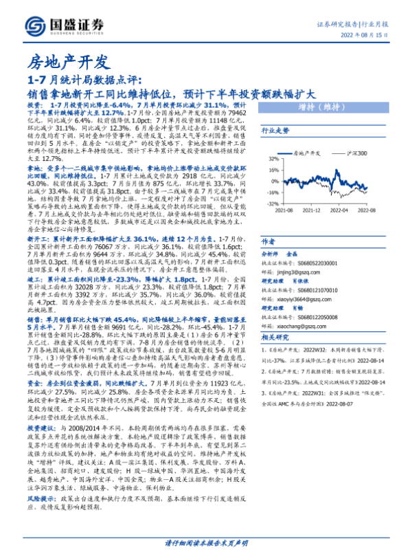 【国盛证券】【20220815】1-7月统计局数据点评:销售拿地新开工同比维持低位,预计下半年投资额跌幅扩大-15页 行业研究