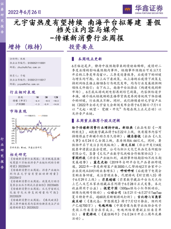 【华鑫证券】【20220626】传媒新消费行业周报:元宇宙热度有望持续 南海平台拟筹建 暑假档关注内容与媒介-21页 行业研究