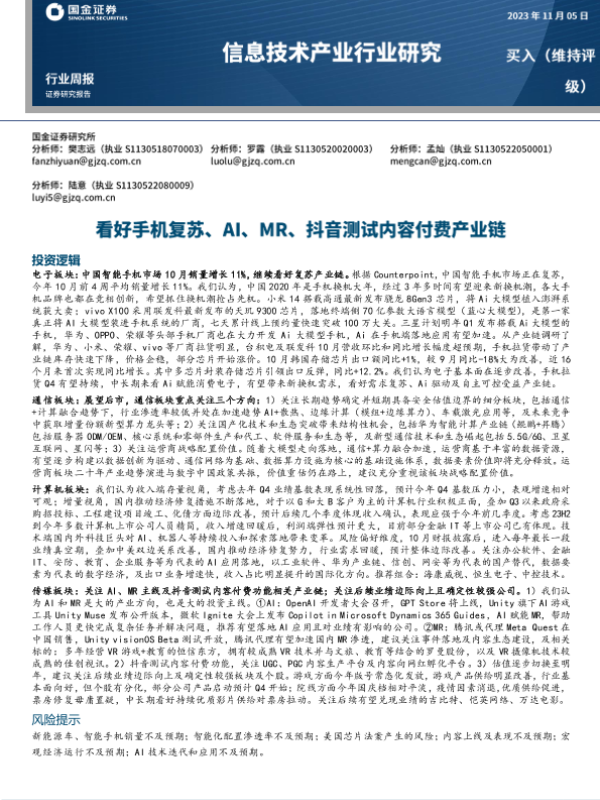 【国金证券】【20231105】信息技术产业行业研究:看好手机复苏、AI、MR、抖音测试内容付费产业链-22页 行业研究