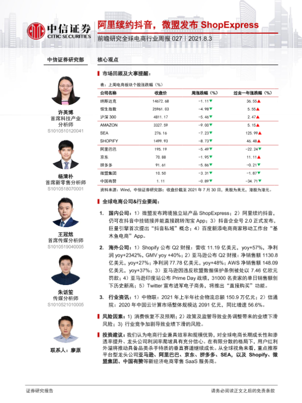 【中信证券】【20210803】前瞻研究全球电商行业周报:阿里续约抖音,微盟发布ShopExpress-19页 行业研究