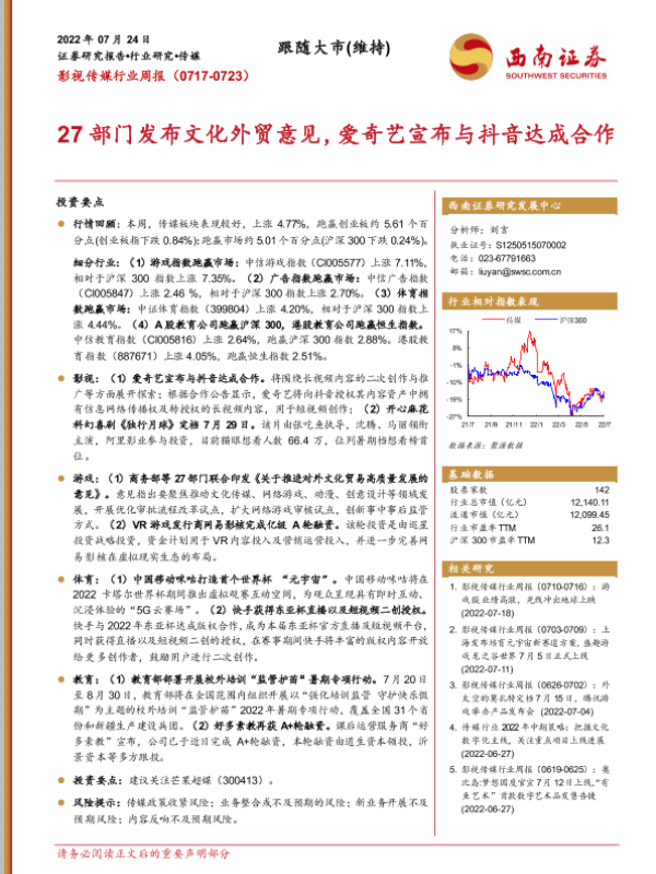 【西南证券】【20220724】影视传媒行业周报:27部门发布文化外贸意见,爱奇艺宣布与抖音达成合作-19页 行业研究