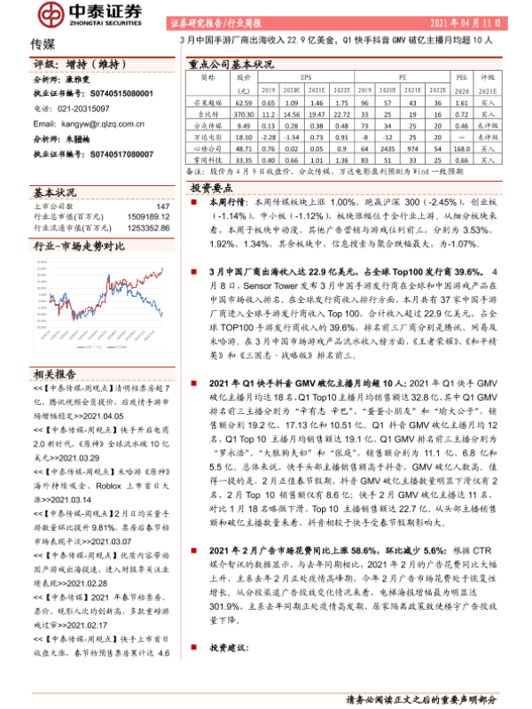 【中泰证券】【20210411】20210411-中泰证券-传媒行业周报:3月中国手游厂商出海收入22.9亿美金,Q1快手抖音GMV破亿主播月均超10人-14页 行业研究
