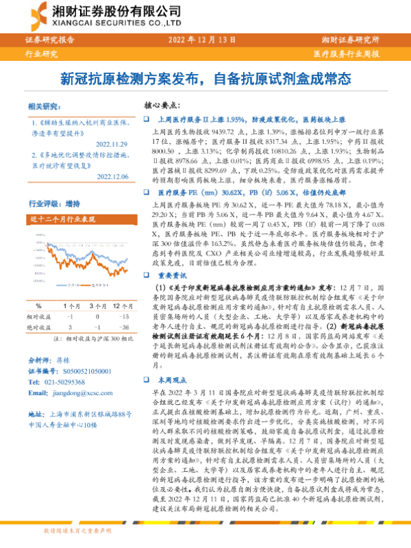 【湘财证券】【20221213】医疗服务行业周报:新冠抗原检测方案发布,自备抗原试剂盒成常态-12页 行业研究